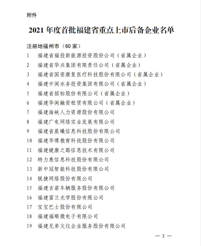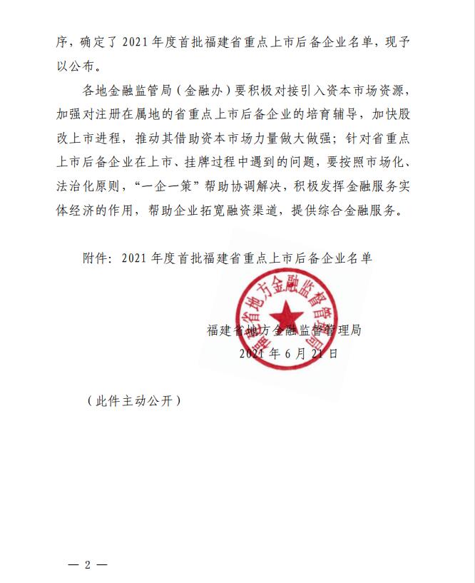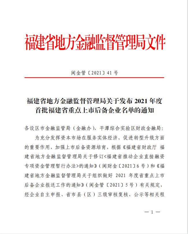 2021年度首批福建省重点上市后备企业通告链接   http://jrb.fujian.gov.cn/xxzx/jrdt/202106/t20210623_5632425.htm