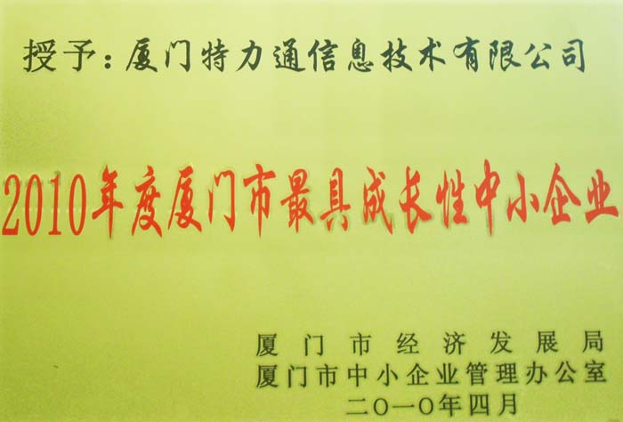 2010年04月 2010年度厦门市最具生长性中小企业